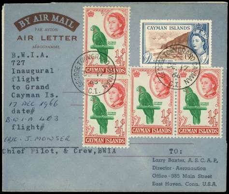 1949-66 B.W.I.A. (British West Indian Airways), four first flight covers, 1949 (1 April) Kingston, Jamaica to Miami, and 1966 (17 December), Inaugural 727 flight to Cayman Islands, air letter with typed details of the flight on face, (used as an illustration in Giraldi/McCann) and cacheted envelope for the same flight, 1953 (9 SP) to Miami
