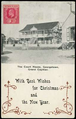 1905 (circa) View of "The Court House, Georgetown, Grand Cayman" with printed Christmas and New Year greeting, franked with 1d KEVII issue but not mailed, short hand-written message on reverse, two small patches of damage, probably from removal from album, attractive and scarce