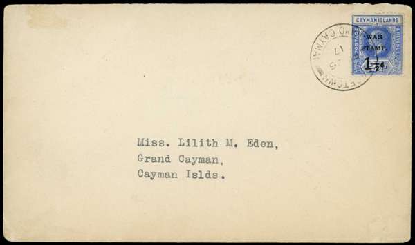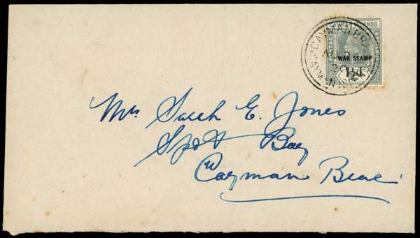 1917-20 War Tax issues used on local mail, many on the first day of issue: 1917 with Type 14 surcharge locally used to Georgetown (26 FE 1917 - first day of issue), 1917 with blocks of four of Type 14 and Type 17 on 2½ d deep blue cancelled with Georgetown cds (4 SP 1917 - first day of issue of the latter), 1919 with a pair of Type 17 on 2½ d yellow cancelled on first day of issue (4 FE 1919), 1920 addressed to Capt. Cook of the Schooner "Fair Hope" at Creek bearing a Type 18 surcharge 1½ d on 2d grey tied by a Cayman Brac cds (12 MY 1920), etc., mostly fine (7 items)