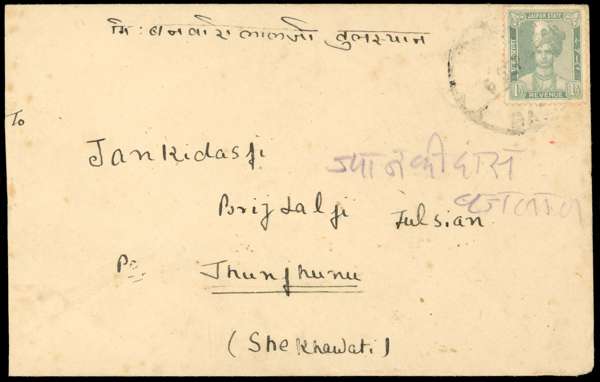 REVENUE: 1949 locally addressed cover bearing Revenue 1a pale green, postally used showing part strike from native cds, trivial odd surface marks, otherwise fine, an interesting cover.