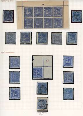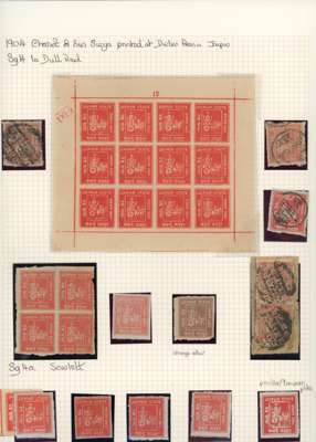 1904 mint and used collection of first ‘Chariot of the Sun God’ issue on leaves, including: ½a pale blue as mint top left hand marginal example with sheet number in red m/s (cat £450), a lower right marginal mint single, two examples used on native covers, SG 1a ½a ultramarine shade mint (£650) and used (£700), SG 3 ½a pale blue ranges with complete sheet of 24 (4x6), ½a deep blue and ultramarine shades, with ½a ultramarine used on piece imperf at top, and ½a deep blue in complete sheet of 24 (4x6), 1a dull red, with 1a scarlet sheets, with 1a dull red in complete sheet of 12 (4x3), 1a scarlet pos. 9 showing litho retouches, 2a pale green in complete sheet of 12 (4x3, cat £160+) and 2a emerald green shade, generally fair to fine condition, a useful lot. SG 1-5