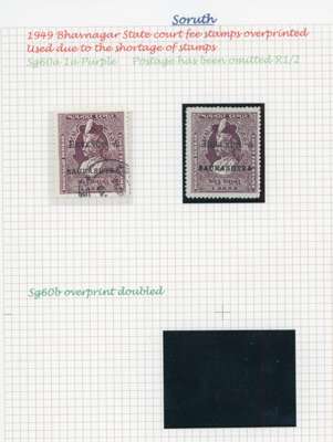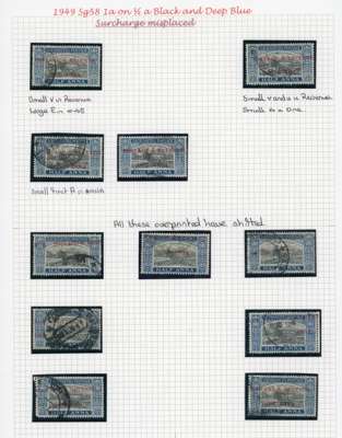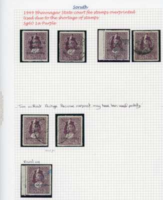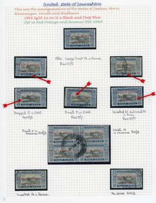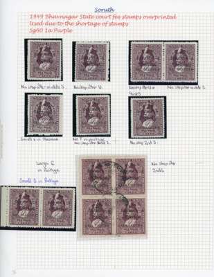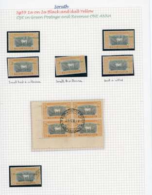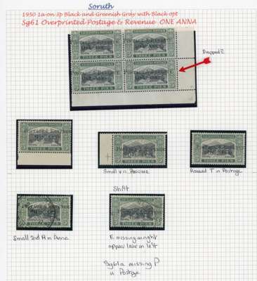 1949-50 surcharges and opts type 19, 20 & 22 on the 1929 Pictorials and opts on Court Fees mint and used collection, including 'ONE ANNA' on ½a black & pale blue noted varieties, dropped letters, inverted, shifts, with listed larger first ’A' in ‘ANNA’ (2); ‘ONE ANNA’ on 2a grey & dull yellow, with lower marginal used block of four, 1949 Court Fee 1a purple with noted minor opt varieties, with error ‘POSTAGE’ omitted (R.1/2) one example unused and regummed, another other fiscally used, and 1950 ONE ANNA on 3p black & blackish green, with noted minor opt varieties, generally fair to fine condition, an interesting lot. SG 58-61
