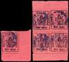 1899-1906 4a black on deep rose, lower right marginal single and in a block of four, all with handstamp in black, unused without gum as issued, some creasing, otherwise fine. SG 20b £300+
