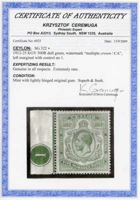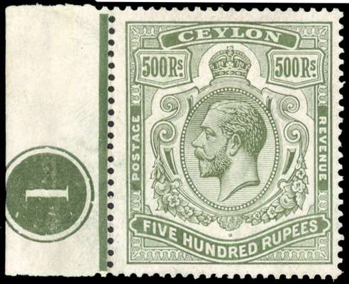 Ceylon 1912-25 500r dull green with plate number 1 S.G. 322 mint cat £8,500