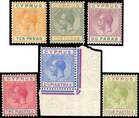 1921-23 Script wmk 10pa (both colours) 30pa, 2pi, 2¾pi & 4pi each showing variety 'Broken bottom left triangle' (Right pane R10/6). 10pa grey and yellow toned and others with minor condition issues, still a fine group of these difficult varieties. S.G. 85a, 86a, 87a, 93a, 94a, 95a cat £1,820