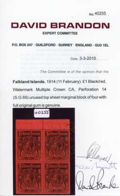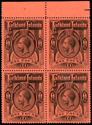1912-20 £1 black/red, upper marginal block of 4 with part centre guide, fresh unmounted o.g., a rare multiple. Brandon cert (2010). SG 69, cat £2200+