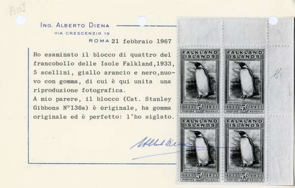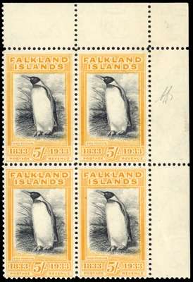 Falkland Islands 1933 Centenary 5s black and yellow-orange block of 4