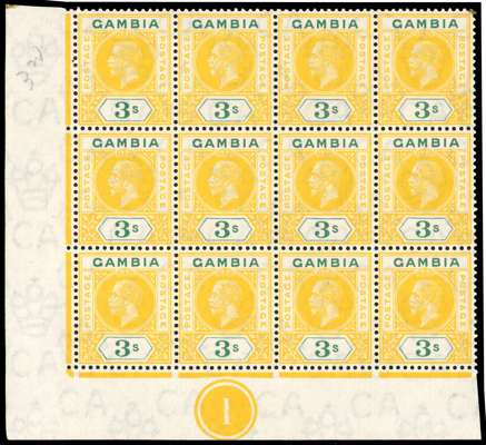 1912-22 3s yellow and green, lower left corner block of 12 (4x3) with plate number ‘1’, showing variety Split ‘A’ (left pane, R8/3), a couple of normal stamps with minor perf tones and gum wrinkles otherwise fine and fresh unmounted o.g., splendid and very rare in this fully positional form. SG 101a, cat £1,125+.