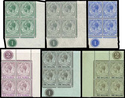 Gibraltar 1912-24 ½d to 1s plate block selection