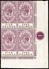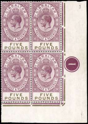 1925-32 £5 violet and black, lower right corner block of 4 with plate number, minor perf separation at top (suitably reinforced) and typical slightly yellowish gum still very fine appearance with fresh colour, large part o.g. with the lower pair remaining unmounted. A spectacular positional multiple of great rarity. SG 108