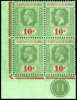 1922-27 10s green and red/emerald, lower left corner block of 4 with plate number, o.g. (three stamps unmounted), slight toning on reverse still an attractive and rare positional piece. SG 35, cat £720++.