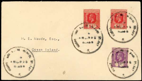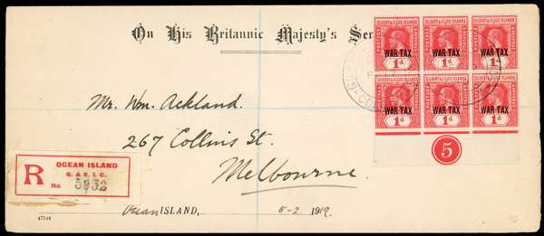 Two covers, with 1919 registered O.H.M.B.S. cover to Melbourne bearing 1918 War Tax lower marginal block of six with Plate number ‘5’ and cancelled by two ‘Gilbert & Ellice Island/Colony’ double ring cds for FE 17 and with Ocean Island registration label alongside, also a cover from Arorae franked by 1922-27 1d violet and 1½d carmine (2) and tied by three indistinct strikes of scarce Type 11 handstamp in Black. Attractive covers. (2)