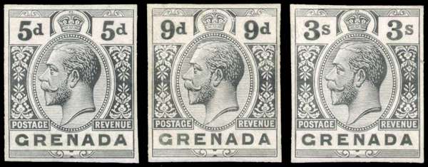 Grenada 1921-31 5d, 9d, 3s stamp-size die proofs