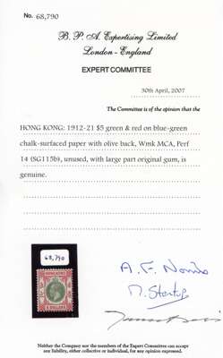 1912-21 $5 green and red/blue-green with OLIVE back, wmk MCA, fresh o.g. BPA cert (2007). SG 115b, cat £1300.