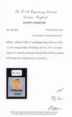 Official. 1925 1r on KGV 25r orange and blue, type O14 surcharge, error SURCHARGE INVERTED, large part o.g. with faintly toned gum as often. Spectacular and rare. BPA cert (2021). SG O103a, cat £7500.