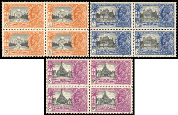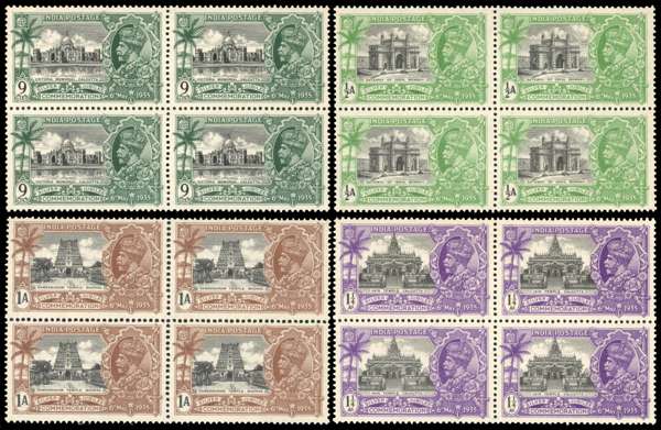 Small range comprising 1929 Air set of 6, 1931 New Delhi set of 6, 1932-36 set of 9 plus 2a small die, and 1935 Silver Jubilee set of 7 blocks of 4, large part o.g. or unmounted o.g. SG 220/46, cat £230+. (50)