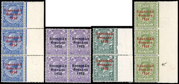 1922-23 2½d, 3d, 4d, 9d, type 5 opt by Thom, block of 4 (3d), marginal vertical pair (4d) or strip of 3 (2½d, 9d), each showing error No Accent in ‘Saorstat’, the 2½d with slight gum creasing and 3d with one short perf otherwise fine o.g. with the errors unmounted. SG 56a, 57a, 58a, 61a, cat £990+.