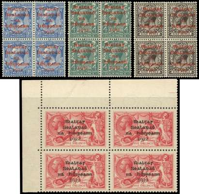 1922-23 mint selection incl 1922 Dollard set to 10d plus 2½d, 4d, 9d red opts in blocks of 4 and 2s6d (both) to 10s, 1922 Dollard 5s corner block of 4, 1922 Thom set to 1s, 1922-23 set to 10s, 1922-23 2s6d variety No Accent (toned gum), and 1922-23 coil stamps set of 4 pairs with Long ‘1’ variety, large part o.g. to o.g. A fine basis for expansion. SG 1/70 btwn, cat £2500+. (97)