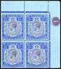1924-32 2s purple and bright blue/pale-blue, Script wmk, upper right corner block of four plate number "1" showing variety "Break in scroll" (R1/12), and “Broken Crown and scroll” (R2/12) unmounted o.g. (hinged in margin only). Rare and highly attractive in this ideal positional form. S.G. 88/a/b cat £600+