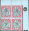 1924-32 2s6d black and carmine/pale blue, Script wmk, upper right corner block of four plate number "1" showing variety "Break in scroll" (R1/12), and “Broken Crown and scroll” (R2/12), left column with some gum loss from previous backing adhesion although both varieties are superb unmounted o.g. Rare and highly attractive in this ideal positional form. S.G. 89/a/b cat £730