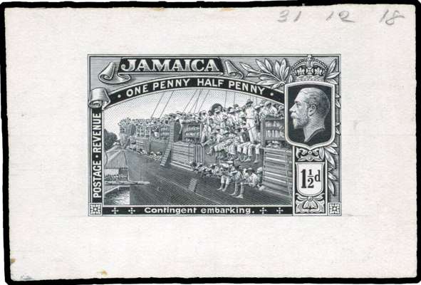 1919-21 1½d die proof in black on highly surfaced wove paper (68 x 45mm), dated ‘31/12/18’ at upper right, fine and scarce. SG 80.