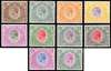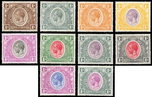 1925 series of eight 1s colour trials, perf 14 on Script wmk paper (wmk upright) in the colours adopted for the additional 1925 values to the 1922-27 set, in brown (2s50), grey (4s), orange-yellow (7s50), purple and yellow (£3), black and magenta (£4), red and green (£20), purple and grey (£75) and red and black (£100), plus a further two examples in blue and magenta, and magenta and grey, presumably rejected colour combinations for the new £4 (issued in black and magenta) and £75 (issued in purple and grey) values, odd blemishes (short perfs, '£4' with tiny surface mark) nevertheless a spectacular and extremely rare series, part to large part o.g. ('4s' without gum). (10)