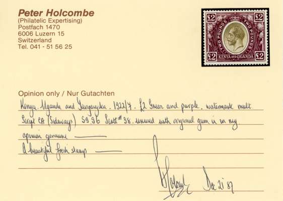 1922-27 £2 green and purple, large part o.g. Holcombe opinion (1987). SG 96, cat £1200.