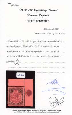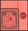 1921-32 £1 purple and black on red, upper right marginal showing Plate number ‘1’ and variety 'Break in Scroll', unmounted o.g., (mounted in margin), an attractive example with fresh colour, BPA cert (2007), SG 80a, Cat £600+