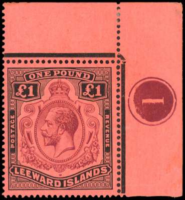 Leeward Islands 1921-32 £1 purple and black on red with Plate number '1' and 'Break in Scroll' variety