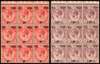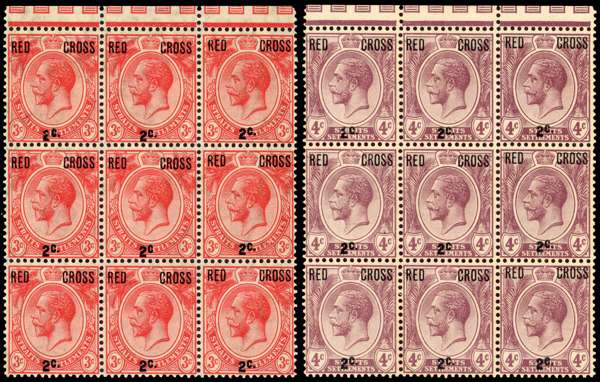 1917 Red Cross 3c+2c, 4c+2c, type 55 surcharge, matching blocks of 9 with interpane margin at top, the centre stamp in each block showing variety No stop (R2/3), trivial adhesions on gum otherwise fine with the varieties remaining unmounted, very scarce. SG 216a/17a, cat £1025+.