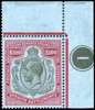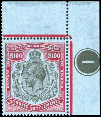 1921-33 $100 black and carmine/blue, Script wmk, upper right corner example with plate number ‘1' showing variety Break in scroll (R1/12), separation between stamp and top margin, and two fractionally toned perfs on reverse of trivial importance, still highly attractive with lovely fresh colour, o.g. with the stamp remaining unmounted. Rare. SG 240ca, cat £19000+