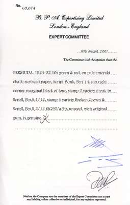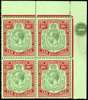 1924-32 10s green & red/pale emerald, Script wmk, upper right corner block of four (plate number "1") showing variety "Break in scroll" (R1/12), and “Broken Crown and scroll” (R2/12), brilliant unmounted o.g. An exceptional positional multiple in choice quality. BPA certificate (2007) S.G. 92/a/b cat £1,780++