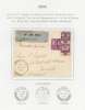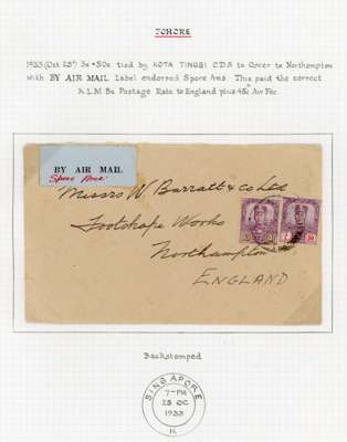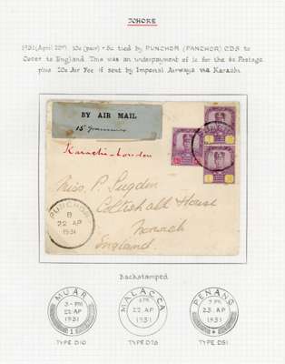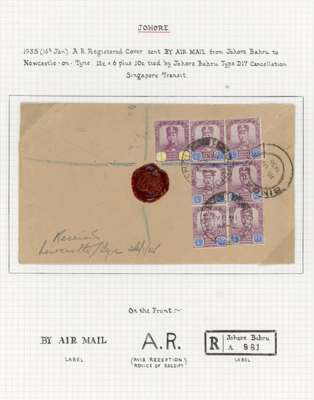 1931-35 group of four airmail covers to England, comprising 1931 from Punchor to Norwich by Imperial Airways franked by 1922-41 6c and 10c pair, 1933 from Kota Tinggi to Northampton by KLM franked by 1922-41 3c and 50c, 1934 Batu Pahat to London by Imperial Airways franked by 1922-41 10c x4, and 1935 registered Avis Reception from Johore Bahru to Newcastle franked by 1922-41 10c and 12c x6, a fine group neatly presented on exhibition pages. (4)