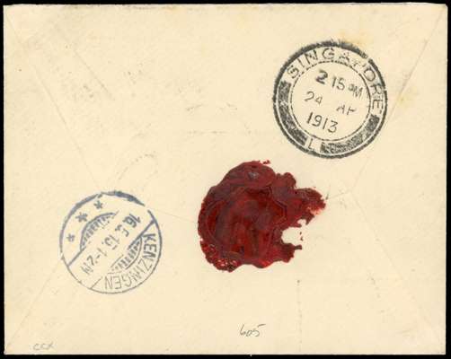 1913 (21 AP) registered cover to Germany, franked by 1910-19 1c and 3c (8) tied by five strikes of ‘TRENGGANU’ cds (Proud type D1) with boxed registraion datestamp (type R1) at lower left, with Singapore (24 AP) and Kenzingen (16.5) backstamps, a fine and neat cover.
