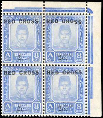 Trengganu 1917-18 Red Cross 8c+2c variety SS in CROSS inverted