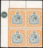1924-32 12s6d grey and orange, upper left corner block of 4 with plate number, brilliant o.g. (pos. 1 unmounted). Folded central vertical perfs, still a lovely and very scarce multiple. S.G. 93, cat £1,000