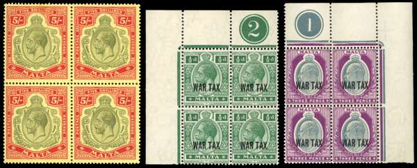 A small KEVII-KGV mint collection on stock pages comprising 1904-14 set to 5s incl shades of ¼d, ½d and 5d, the 2d grey exceptionally with variety Broken Crown, 1914-21 set to 5s incl most listed shades (some with plate numbers), 1914-21 5s block of 4, and 1917-18 War Tax ½d, 3d in plate blocks of 4, mint large part o.g. to o.g., odd imperfections but a very useful basis for continuation. SG 45/93, cat £1600+. (57)