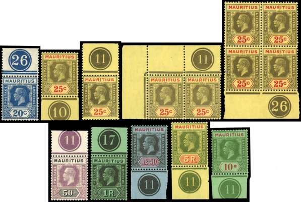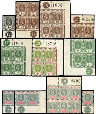 1921-34 set to 10r (less 20c purple), Script wmk, lightly duplicated range of plate number singles, pairs and blocks (several with sheet number) incl 4c green and red pl. 23 block of 4, 5c pl. 10 horizontal pair and single, 8c pl. 16 single, 10 pl. 17 single, 10c pl. 23 block of 4, 12c grey pl. 10 single, 12c grey pl. 17 single, 12c red pl. 10 block of 4, 25c pl. 10 single, 25c pl. 11 horizontal pair and single, 50c pl. 11 single, 1r pl. 17 single, 2r50 pl. 11 single, 5r pl. 11 single, and 10r pl. 11 single, mainly fine o.g. with many unmounted, a splendid accumulation and an ideal basis for expansion. SG 223/41. (34) cat £1150+