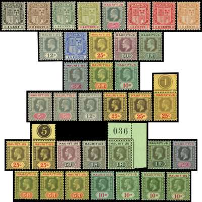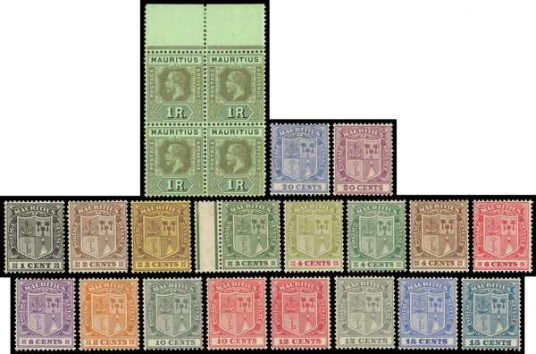 Mint selection on stock pages comprising 1910 set to 10r, 1913-22 set to 10r incl listed shades, 1913-22 1r black/emerald (olive back) block of 4, 1921-26 set to 20c (both), 1921-34 set to 10r incl listed shades, and 1925 surcharge trio matching upper marginal with plate number, cond varies. SG 181/244, £1500+.
