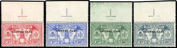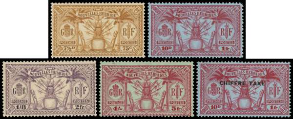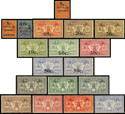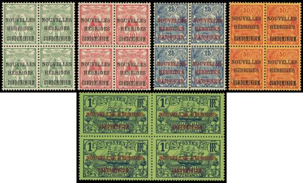 French Inscriptions. 1910-25 mint collection on stock pages, appears to be complete for period incl 1910-11 set of 5 in blocks of 4, 1913, set to 5f, 1920-21 surcharges (noted rare 5c on 50c without ‘CONDOMINIUM’ opt), and 1925 postage due set of 5, cond varies with some gum wrinkling, large part o.g. to o.g. with many unmounted o.g., an excellent basis for expansion. SG F6/F52, FD53/FD57, cat £1463. (69)