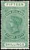 Postal Fiscal. 1913 15s green, DLR chalk-surfaced paper, wmk 43 sideways, perf 14, large part o.g. with fresh colour. Very scarce. SG F96, cat £1300.