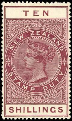 New Zealand 1913-21 postal fiscal 10s maroon DLR paper perf 14½x14