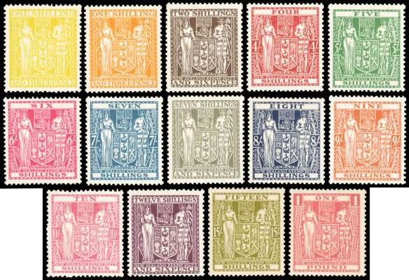 Postal Fiscals. 1931-40 ‘Arms’ set of 14 to £1 (incl both 1s3d), Cowan paper, wmk 43, mainly fine large part o.g. SG F145/158, cat £865.
