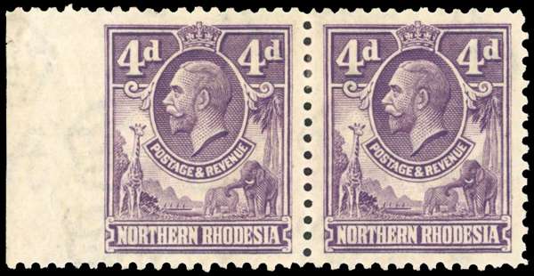 1925 4d violet, horizontal pair, left stamp showing variety IMPERFORATE BETWEEN STAMP & MARGIN, large part o.g. brownish slightly crazed gum with slight loss in margin (as affects all the examples of this error we have seen), Still a spectacular variety and a great rarity of Northern Rhodesia with a maximum of ten possible. S.G. 6/var