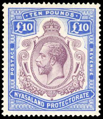 Nyasaland 1913-19 £10 purple and dull ultramarine fine mint, S.G. 99, £8,500