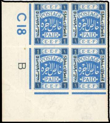 Palestine 1918 5m on 1p ultramarine control C 18 B block of 4