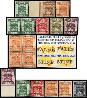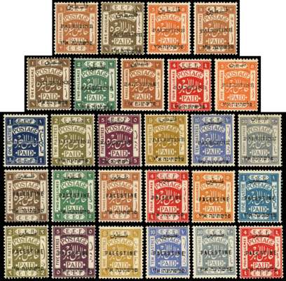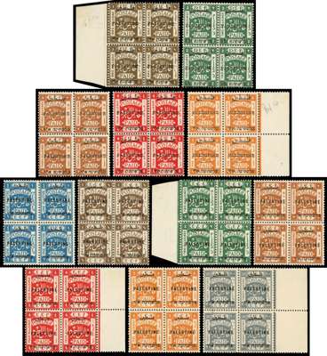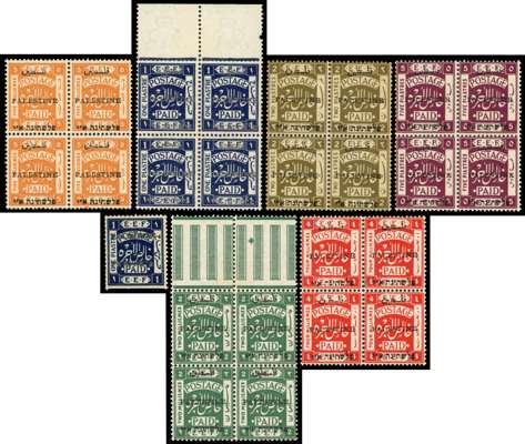 Small collection on stock pages comprising 1918 set to 20p with shades, 1920 ‘Jerusalem I’ perf 15x14 set to 20p incl 2p var Arabic ‘Z’ and ‘PALESTINB’ and values to 5p as blocks of 4, 1920 ‘Jerusalem I’ perf 14 set incl 5m block of 4 with horizontally shifted opt ('Hebrew at top'), 1920-21 ‘Jerusalem II’ vals to 5p incl blocks of 4, perf 14 set to 5p (less 1m), and narrow setting 1m, 3m, 5m (2, one with ‘mixed perf’ variety (Bale 44b)), 1921 ‘Jerusalem III’ set to 20p, and 1921-22 'Somerset House' set to 20p incl 4m var Arabic ‘40’ and set to 1p plus 20p as blocks of 4, cond varies but mostly fine large part o.g. to unmounted o.g., a fine basis for expansion. Cat £3500++ (152)