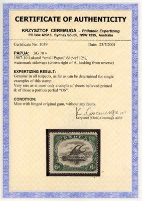 1907-10 'Small PAPUA' 6d black and myrtle-green, wmk sideways, perf 12½, typical centring to right, part o.g. (disturbed, with small stain at right edge) and with thinning in upper margin though a very rare stamp indeed which is missing from most collections of this iconic issue. Only 60 existed without the 'OS' perfin. Clear Ceremuga cert (2001). S.G. 70 (cat £5,500)