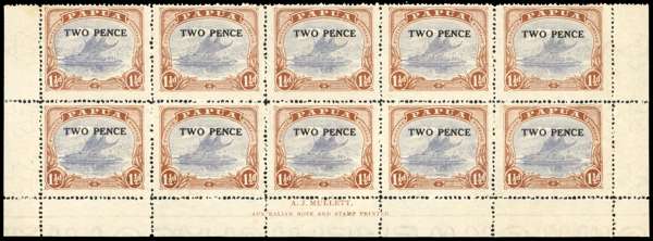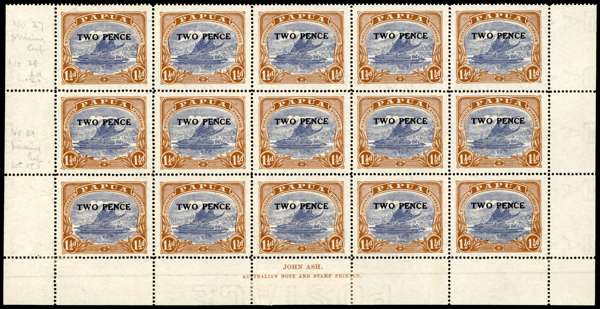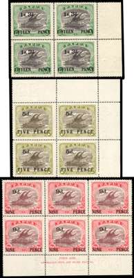 1917 ‘ONE PENNY’ surcharge set of 7 incl both shades of ½d, 1931 ‘TWO PENCE’ surcharges as lower marginal imprint blocks of 10 (Mullett printing) or 15 (Ash printing), and 1931 surcharges set of 4 incl 1s3d on 5s block of 4, 5d on 1s upper right corner block of 4, and 9d on 2s6d Ash imprint block of 6, mainly fine large part o.g. SG 106/111, 121/126, cat £449+ (50)
