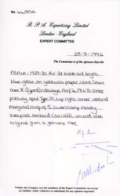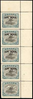 1929-30 Air 3d black and bright blue-green upper right corner marginal vertical strip of five, variety OVERPRINT OMITTED, unmounted o.g. Spectacular and excessively rare- just A single sheet with the overprint omitted on the fifth and sixth horizontal rows was discovered in 1929 by the London dealer, Richard Roberts. Light pencil notation ‘RR’ on reverse not mentioned by clear BPA cert (1996)